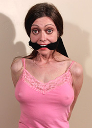 These are never-before-released photos from a babysitter bondage video plus TWO more tie-up positions! It goes like this: Mom Natasha Flade has two boys, and they’re wanting to wish her a happy birthday. They say they have a gift, but she has to close her eyes so she can’t see them coming in with it. She thinks the idea is sweet, so she goes along. Next thing she knows, she's tied-up barefoot in her sweater and jeans, soles atop the coffee table. There's chest ropes attached to her bound knees and she's also cleave-gagged made from an old pillow case!