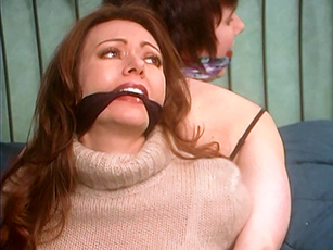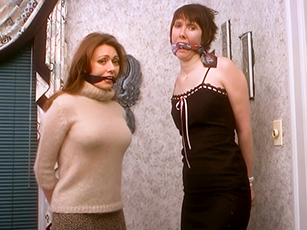 But you must make sure they don't get loose while you check up on the cops. So now they're tied up back-to-back on the bed, the cleave-gags still in their mouths. Their legs (in pantyhose!) are bound above the knees and at the ankles. Mom and Tutor both tied-up together! It’s a sight you’ve dreamed of forever! You leave your captives to struggle, but you can hear them gag-talking about you, so you holler for them to get back to mmphing like the kidnapped damsels that they are. And so they do! Dahlia and Natasha struggle and mmph until they fall right over on the bed! They start calling for you through their gags to rescue them from their fallen position!