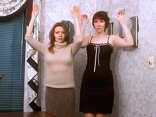 Now you're a criminal on the run! You pull a pretend gun and order them to put their hands up. They obey, acting like helpless damsels. You have them stand side-by-side and cross their wrists behind them. Soon you have their hands bound and their mouths cleave-gagged. You tell your captives that you have to hide them, so you march them upstairs one-by-one! You walk behind Mom up the stairs to the bedroom and she sits down on the bed as ordered. Your tutor Natasha Flade is next, and now you have these two tied-up damsels seated side-by-side on the bed!