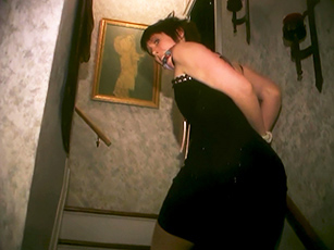 Natasha Flade is wearing a long black skirt, silk blouse and flip flops (then barefoot) in this babysitter bondage video!