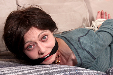 Mom Natasha smiles and agrees. How she loves to indulge her kids! So she's untied and her boys have her sit on the sofa and cross her hands behind her back to be tied. Her ankles are bound next and she gets another cleave gag from a black scarf. She puts on a great damsel show, wiggling playfully and making lots of pouty expressions with her wide eyes. But she smiles and laughs a lot, too.