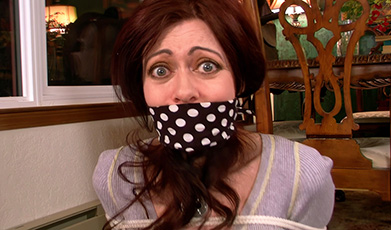 These are never-before-released photos from a babysitter bondage video plus TWO more tie-up positions! It goes like this: Mom Natasha Flade has two boys, and they’re wanting to wish her a happy birthday. They say they have a gift, but she has to close her eyes so she can’t see them coming in with it. She thinks the idea is sweet, so she goes along. Next thing she knows, she's tied-up barefoot in her sweater and jeans, soles atop the coffee table. There's chest ropes attached to her bound knees and she's also cleave-gagged made from an old pillow case!